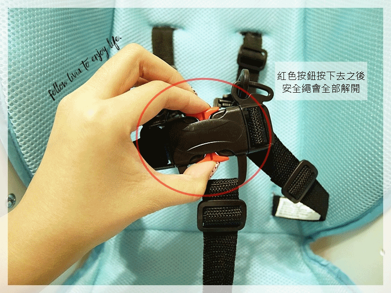 寶貝的安全扣環是設計為五段式,左右兩側加上下方通通有注重到,