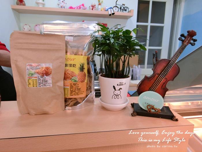 除了一般的冰品飲料外,Amour老闆選用關廟鳳梨所烘焙而成的鳳梨果乾