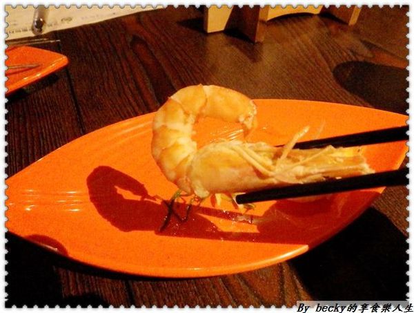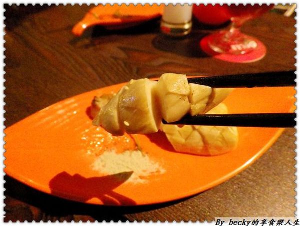 在杏鮑菇旁有附上芥末鹽,咬了一口杏鮑菇,裡頭多汁,杏鮑菇味重,個人偏好沾上芥末鹽才夠味。