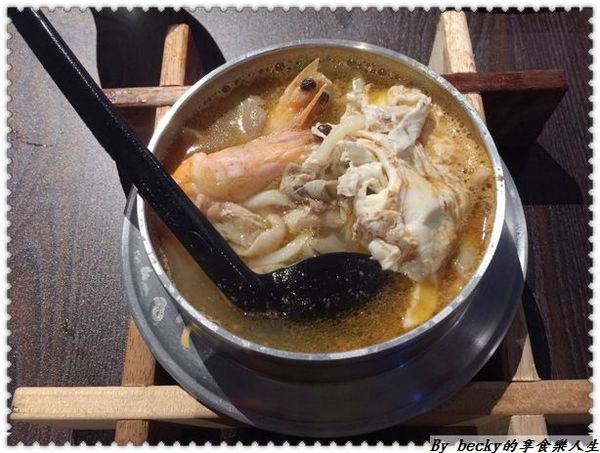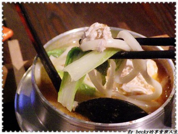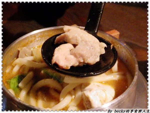 這個鍋燒烏龍麵沙茶味重,裡頭有蝦、蛋、小白菜及菇等等食材,這些一同煮食,湯頭還帶有鮮味,裡頭則是雞肉塊,吃起來鮮嫰,而麵條則是細麵,吃起來有些偏軟,整個味重非常不錯,特別的是蝦子還去殼喔!真是貼心。