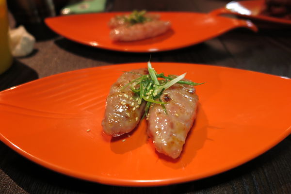 同樣老闆是把豬肉打碎,再組合去烤的,這豬肉入口會噴汁的呢
