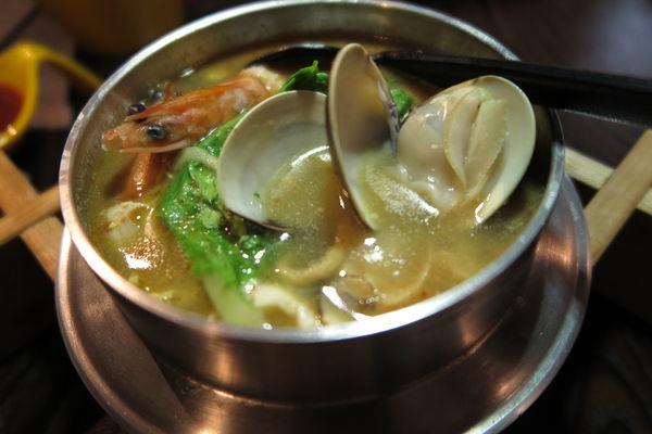 這麵是老闆用新鮮雞骨煮的湯底,有淡淡沙茶味道,海鮮都很新鮮,由其那兩顆大蛤蜊,入口鮮甜
