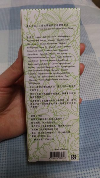 三重玻尿酸抗痘淨膚精華液的外包裝,