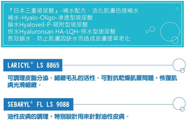 三重玻尿酸抗痘淨膚精華液除了添加日本的三重玻尿酸 ─ 滲透型、吸附型、保水型玻尿酸外,
