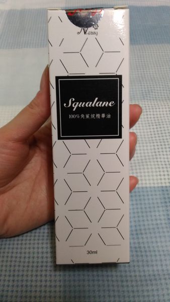 100%角鯊烷精華油的外包裝,上面的圖案像是化學結構呢。