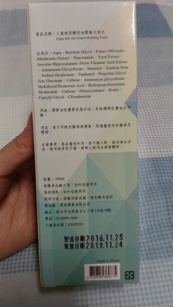 三重玻尿酸控油緊緻化妝水的外包裝。