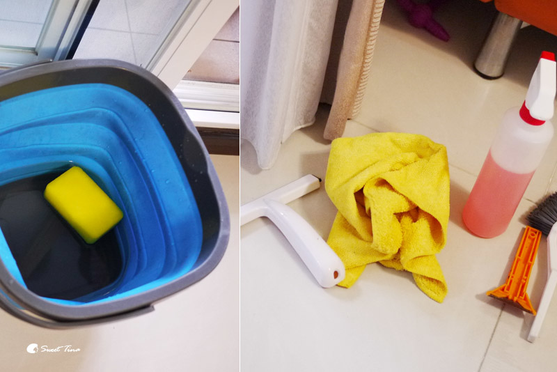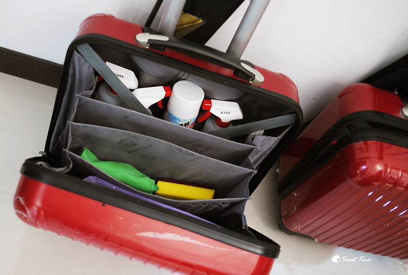 Tina很好奇這小行理箱裝了些什麼東西,就趁他們打開時瞧瞧,裡面有點像小叮噹的百寶箱,清潔用品,輔助工具都有外,連水桶都自備了,真的太專業了。