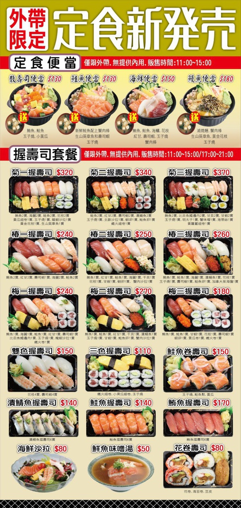 外帶限定:每天中午11:00~15:00(定食、握壽司)