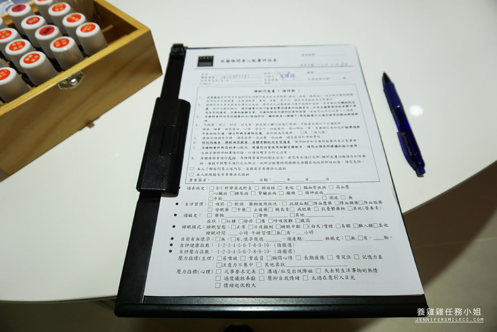 接著因為第一次來到依蘭雅閑,所以Jamie給了我一張表格填寫我個人的生理狀態。前面這一面幾乎是自己填寫,後面那一面有些會是芳療師用詢問的方式進行。