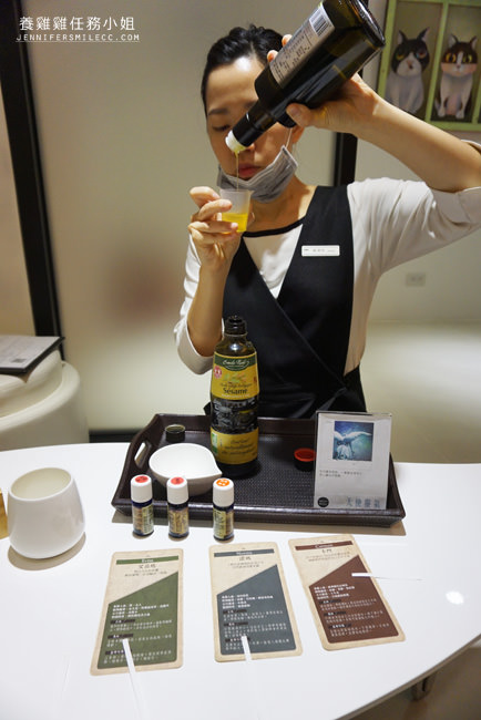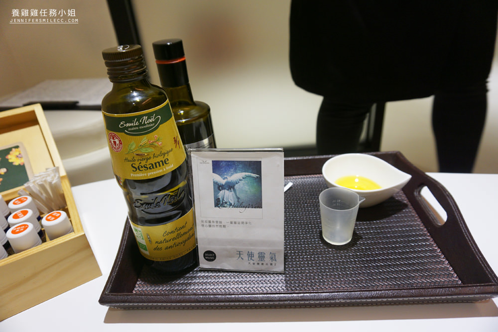 接著Jamie開始幫我調製今天我要用的按摩油,依蘭雅閑用的按摩油是地中海國家產的有機冷壓橄欖油和有機初榨芝麻油,加上特定比例的精油。雖然之前就知道好的橄欖油可以拿來當按摩油,但這是第一次真的遇到SPA會館是用食用油作為按摩油,覺得很期待,特別是用我最喜歡的那個精油作為基底的按摩油 :lol:
