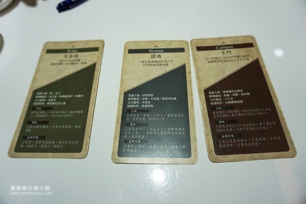 從20多張牌中,靜下心來抽出了三張牌,說也很妙,這三張牌我覺得超級代表我的心理狀態的。大概的意思是說我是個很刻苦耐勞的小姐,應該對自己好一些,聽到這邊我點頭如搗蒜啊!本來女人就是要多愛自己一些了對吧(很有藉口) :lol: 這每張牌都有自己對應的精油,我非常喜歡第一張牌艾薇塔對應的精油香味,據說裡面的成分是永生花,應該是大部份女生都會很喜歡的一款。