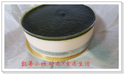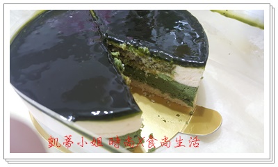 從側面可以看到是層層抹茶堆疊起來的,底層是海綿蛋糕,再來是抹茶起司慕斯,