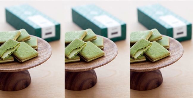 餅乾外表淡淡的抹茶綠,薄薄的一片中間還夾著起司白巧克力