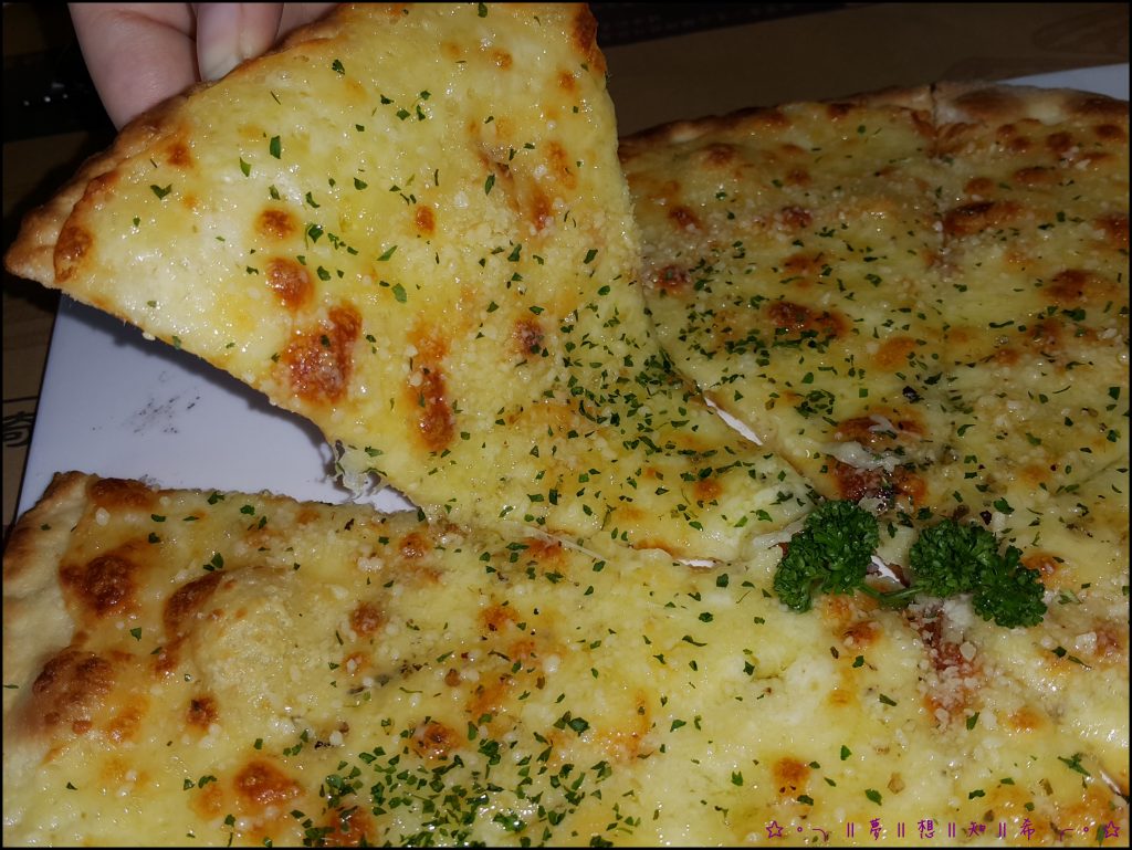 義式起司披薩它有滿滿的起司,拿起來還會牽絲,上面還有起司粉來增加起司口味。