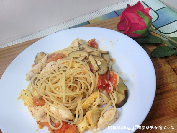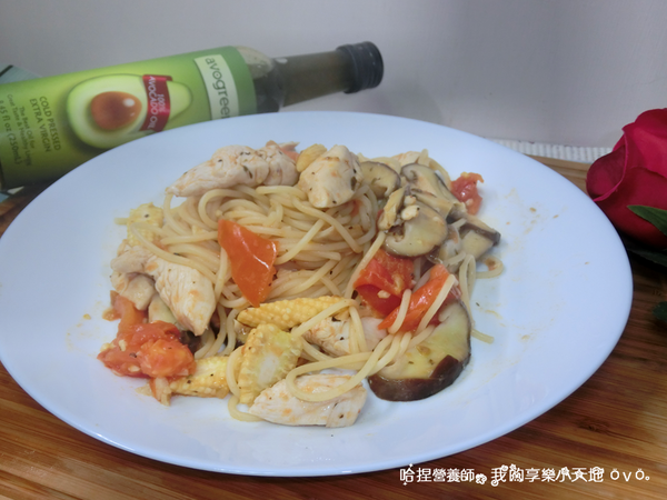 義大利麵60g、雞柳條60g、香菇2朵、牛番茄1顆、玉米筍2根、蒜頭2瓣、酪梨油10c.c.、鹽適量、黑胡椒粒適量、義大利香料適量
