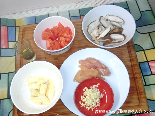 2. 雞柳條切細條、香菇切片、蕃茄和玉米筍切大丁、蒜頭切末備用。
