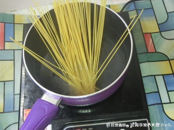 1. 燒一鍋熱水煮義大利麵7分鐘左右,撈起備用。
