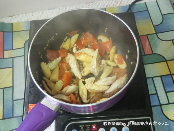 3. 熱鍋倒入酪梨油炒香蒜頭,再加入香菇片炒軟,然後加入小蕃茄,最後加入玉米筍和雞柳條拌炒,可加適量的水並加鹽調味。