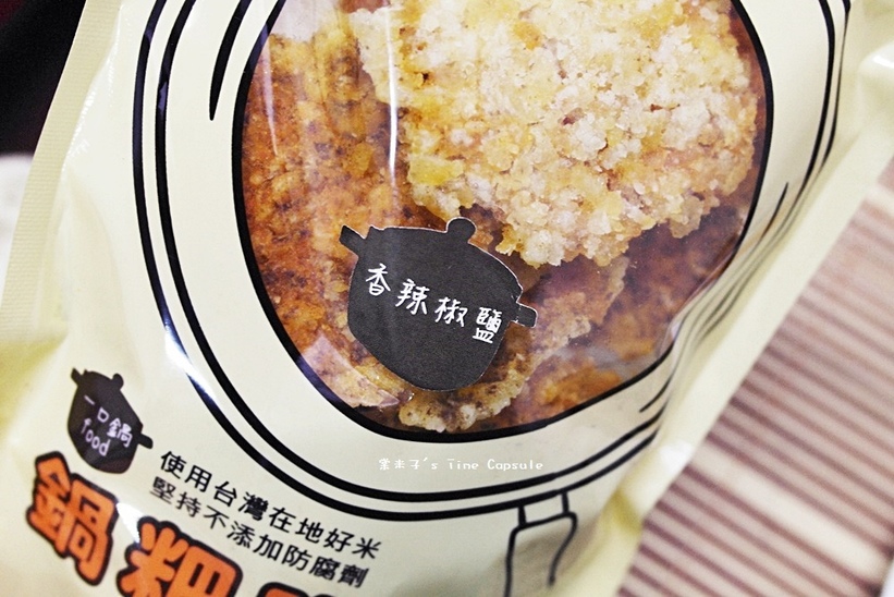 正面包裝袋面上皆以小鍋子貼紙來呈現該包鍋粑口味,